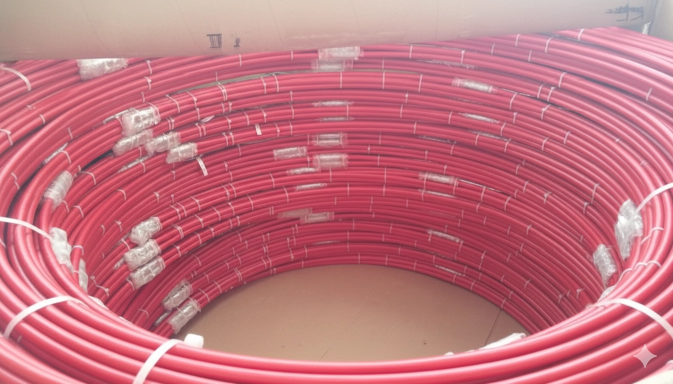 Os componentes incluem âncoras, hastes e uma cabeça de referência com sensores de deslocamento. Os componentes são normalmente entregues pré-montados e enrolados, prontos para instalação.