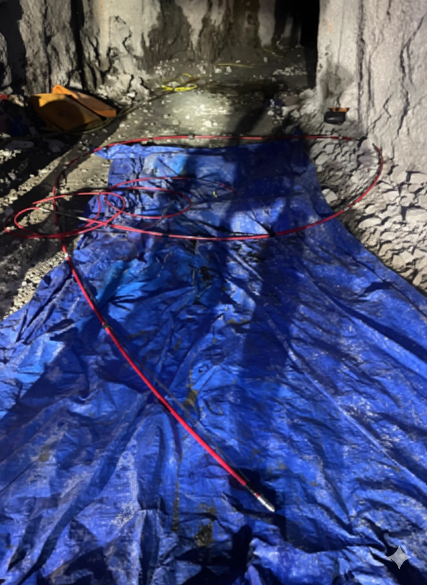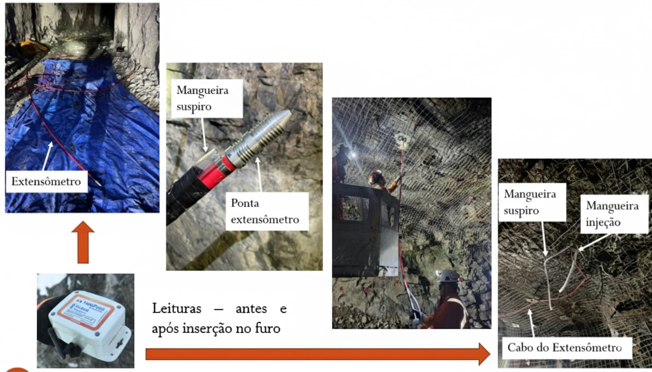Âncoras e hastes são instaladas em profundidades específicas no furo de sondagem. As hastes estendem-se das âncoras até a cabeça de referência na boca do furo.
