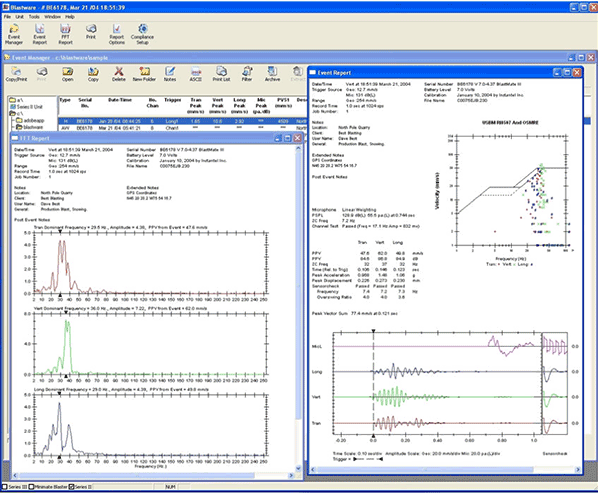 O software de processamento importa dados do monitor de vibração e gera relatórios de conformidade com histogramas, formas de onda e gráficos de limite.